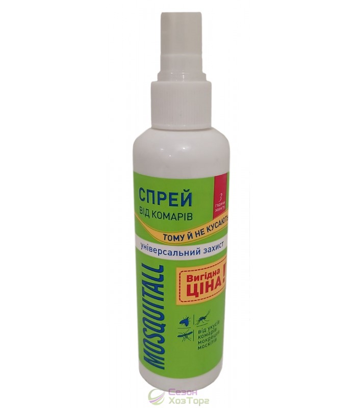 Спрей MOSQUITALL предназначен для нанесения на одежду и кожу, защищает от укусов комаров, мокрецов, москитов. Рекомендуется использовать при нахождении на улице, в походе, лесу, у водоемов. Сроки действия средства - до 3 часов.