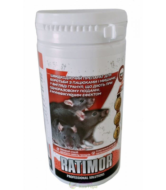 Ratimor - готовая к использованию родентицидная приманка в виде гранул красного или розового цвета для борьбы с крысами и мышами. Состав: бромадиолон - 0,005% (субстанция из группы антикоагулянтов), а также пищевые составляющие, гормональные субстанции, которые привлекают грызунов, и мумификаторы, тормозящие разложение погибших грызунов. Для защиты детей и домашних животных от отравления в состав препарата входит битрекс с отталкивающим запахом.