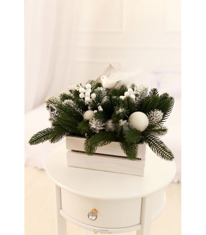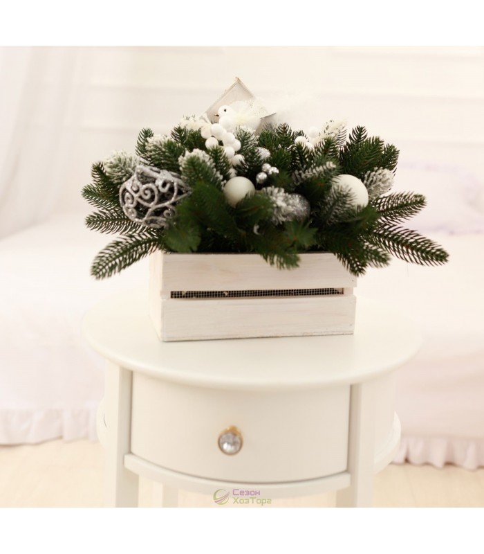 С давних времен еловые ветви считаются одним из важнейших рождественских символов. Они символизирует счастливую жизнь, достаток, семейное благополучие. Каждый элемент декора имеет сакральный смысл и влияет на процветание весь последующий год. Композиция из декорированной хвои в деревянном кашпо украсит любое пространство, станет чудесным подарком в преддверии Сочельника, Нового Года.