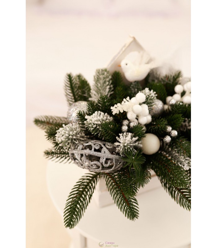 Новогодняя композиция в деревянном кашпо "Green-blue"