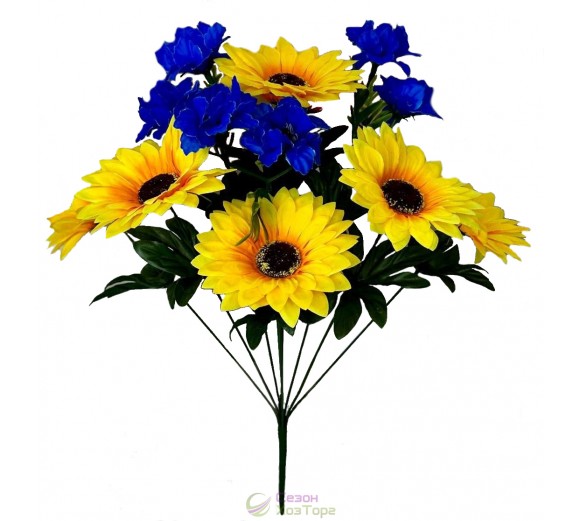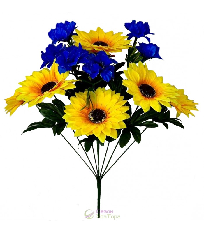 Букет из искусственных желто-синих цветов гвоздик, васильков и ромашек 47см (№6173)