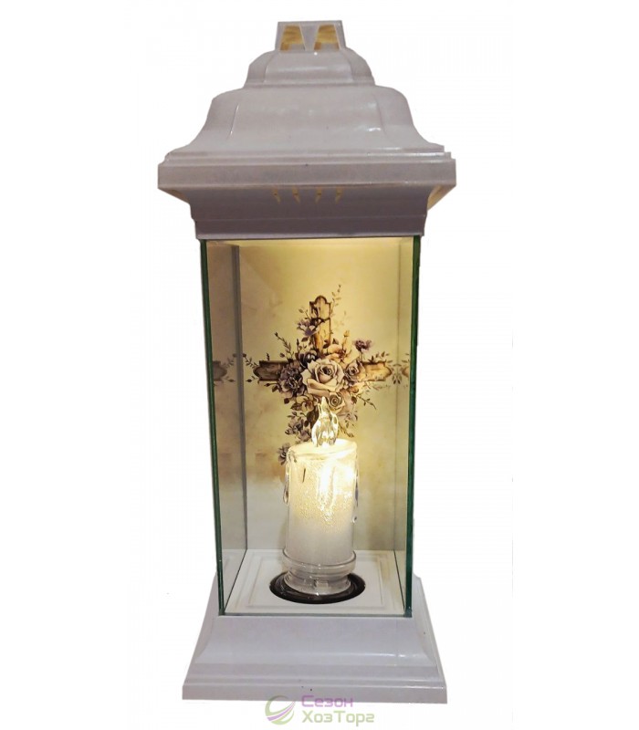 Лампадка витражная стеклянная, лампада поминальная является одним из обязательных обрядовых атрибутов христианской веры, используемая при крещении, венчании, погребении. Чаще всего лампадку ставят в честь святого праздника Пасха, в поминальные дни. Данная лампадка содержит свечу-led, в которой в последствии можна заменить батарейки. Модель имеет прямоугольную форму, выполнена в белом дизайне. На внутренней стенке корпуса нанесено изображение креста. В комплект входит пластиковая куполообразная крышка и подставка.