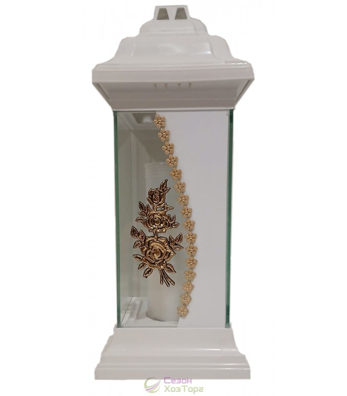 Лампадка стеклянная, лампада поминальная является одним из обязательных обрядовых атрибутов христианской веры, используемая при крещении, венчании, погребении. Чаще всего лампадку ставят в честь святого праздника Пасха, в поминальные дни. Данная лампадка содержит свечу из парафина до 120 часов горения. В последствии можна заменить израсходованную свечку на новую. Модель имеет прямоугольную форму, выполнена в бело-золотом дизайне. На стенке корпуса нанесен рельефный рисунок в виде розы. В комплект входит пластиковая куполообразная крышка и подставка.