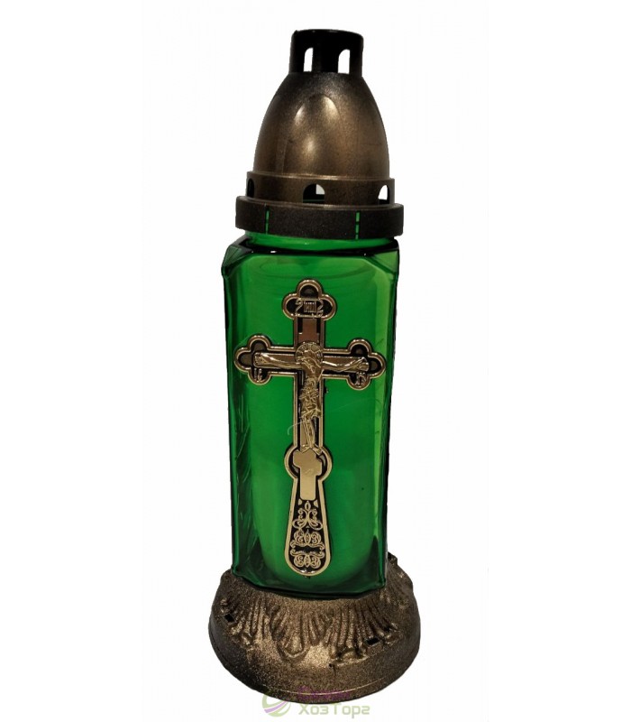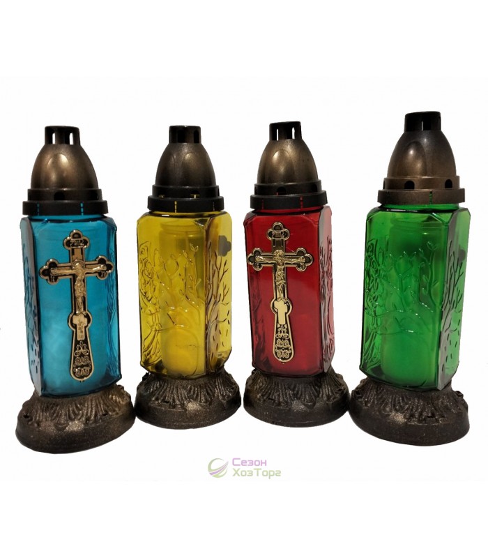Лампадка стеклянная, лампада поминальная является одним из обязательных обрядовых атрибутов христианской веры, используемая при крещении, венчании, погребении. Чаще всего лампадку ставят в честь святого праздника Пасха, в поминальные дни. Данная лампадка содержит свечу из парафина до 36 часов горения. В последствии можна заменить израсходованную свечку на новую. Модель имеет прямоугольную форму, выполнена в разных цветах. На стенке корпуса нанесен рельефный рисунок в виде креста. В комплект входит пластиковая куполообразная крышка и подставка.