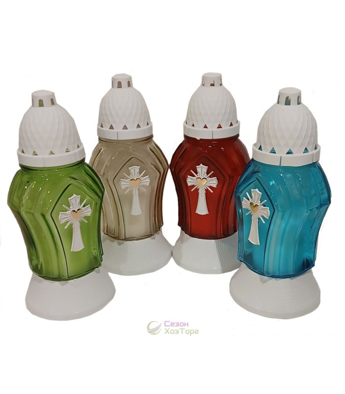 Лампадка стеклянная, лампада поминальная является одним из обязательных обрядовых атрибутов христианской веры, используемая при крещении, венчании, погребении. Чаще всего лампадку ставят в честь святого праздника Пасха, в поминальные дни. Данная лампадка содержит свечу из парафина до 36 часов горения. В последствии можна заменить израсходованную свечку на новую. Модель имеет прямоугольную форму, выполнена в разных цветах. На стенке корпуса нанесен рельефный рисунок в виде креста. В комплект входит пластиковая куполообразная крышка и подставка.