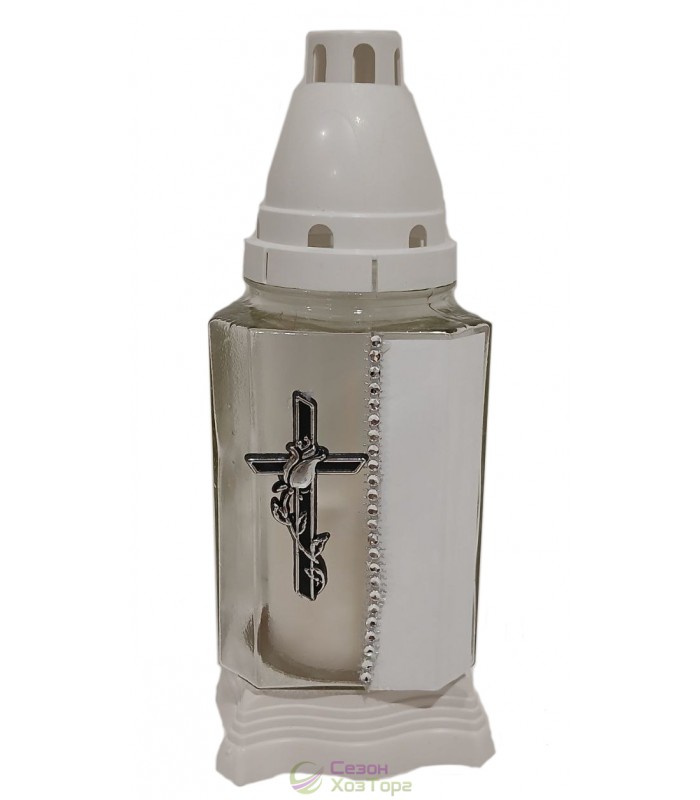Лампадка стеклянная, лампада поминальная является одним из обязательных обрядовых атрибутов христианской веры, используемая при крещении, венчании, погребении. Чаще всего лампадку ставят в честь святого праздника Пасха, в поминальные дни. Данная лампадка содержит свечу из парафина до 36 часов горения. В последствии можна заменить израсходованную свечку на новую. Модель имеет прямоугольную форму, выполнена в разных цветах. На стенке корпуса нанесен рельефный рисунок в виде креста. В комплект входит пластиковая куполообразная крышка и подставка.