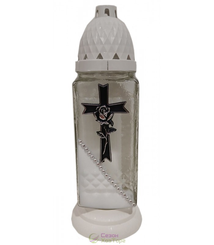 Лампадка стеклянная на 36 часов "Крест с розой/белый край"