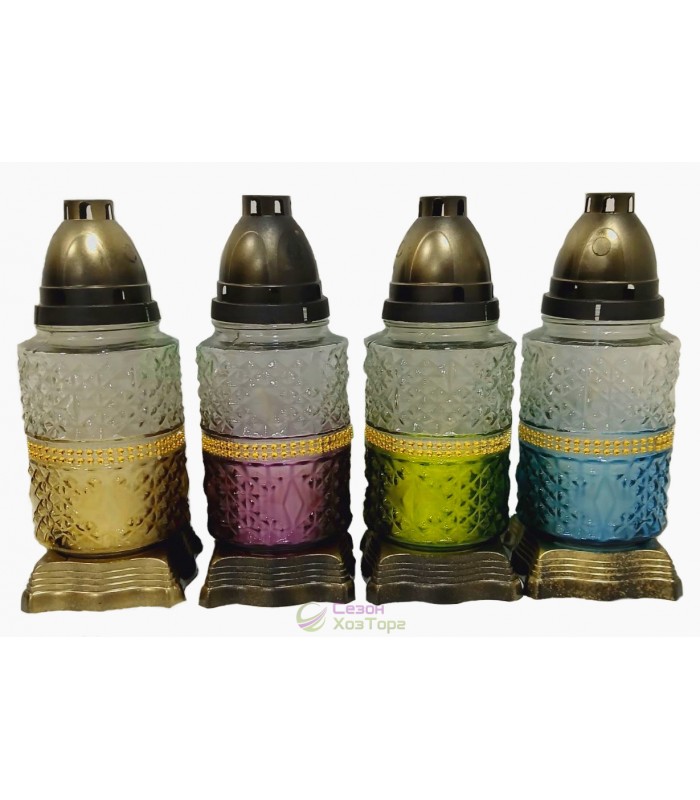 Лампадка стеклянная, лампада поминальная является одним из обязательных обрядовых атрибутов христианской веры, используемая при крещении, венчании, погребении. Чаще всего лампадку ставят в честь святого праздника Пасха, в поминальные дни. Данная лампадка содержит свечу из парафина до 36 часов горения. В последствии можна заменить израсходованную свечку на новую. Модель имеет фигурную форму, выполнена в двух цветах. В комплект входит пластиковая куполообразная крышка и подставка.