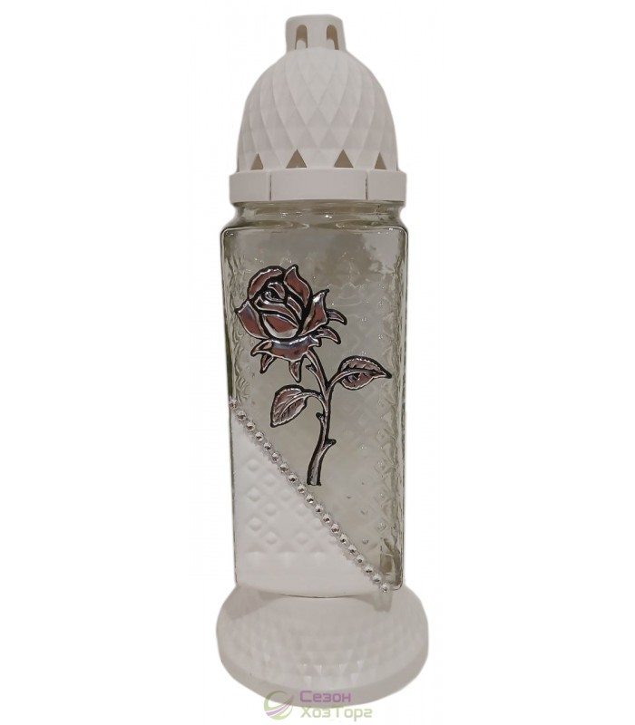 Лампадка стеклянная, лампада поминальная является одним из обязательных обрядовых атрибутов христианской веры, используемая при крещении, венчании, погребении. Чаще всего лампадку ставят в честь святого праздника Пасха, в поминальные дни. Данная лампадка содержит свечу из парафина до 36 часов горения. В последствии можна заменить израсходованную свечку на новую. Модель имеет прямоугольную форму, выполнена в разных цветах. На стенке корпуса нанесен рельефный рисунок в виде цветка розы. В комплект входит пластиковая куполообразная крышка и подставка.