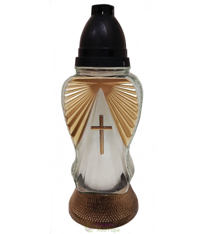 Лампадка стеклянная, лампада поминальная является одним из обязательных обрядовых атрибутов христианской веры, используемая при крещении, венчании, погребении. Чаще всего лампадку ставят в честь святого праздника Пасха, в поминальные дни. Данная лампадка содержит свечу из парафина до 48 часов горения. В последствии можна заменить израсходованную свечку на новую. Модель имеет фигурную форму, украшение в виде креста, выполнена в золотом и коричневом цвете. На стенке корпуса нанесен рельефный рисунок. В комплект входит пластиковая куполообразная крышка и подставка.