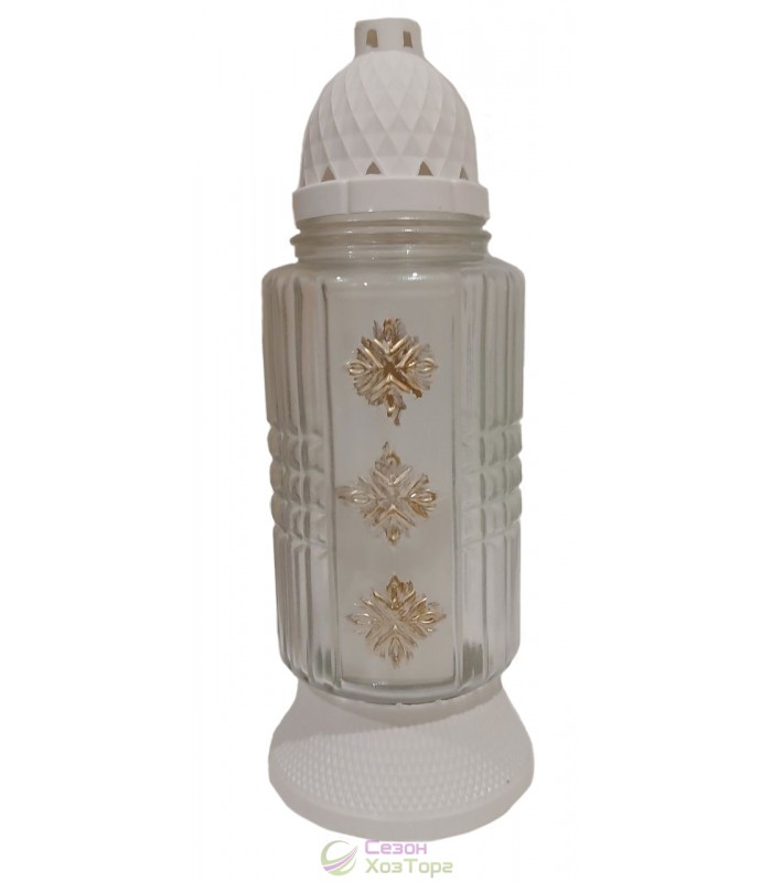 Лампадка стеклянная, лампада поминальная является одним из обязательных обрядовых атрибутов христианской веры, используемая при крещении, венчании, погребении. Чаще всего лампадку ставят в честь святого праздника Пасха, в поминальные дни. Данная лампадка содержит свечу из парафина до 60 часов горения. В последствии можна заменить израсходованную свечку на новую. Модель имеет фигурную форму, на наружной поверхности корпуса - украшение в виде рельефного орнамента. В комплект входит пластиковая куполообразная крышка и подставка.