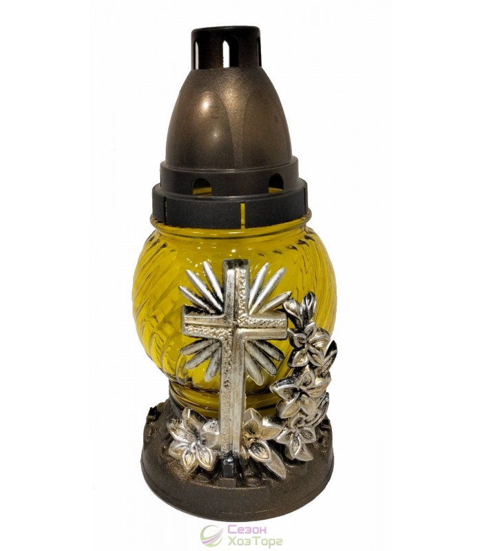 Лампадка стеклянная, лампада поминальная является одним из обязательных обрядовых атрибутов христианской веры, используемая при крещении, венчании, погребении. Чаще всего лампадку ставят в честь святого праздника Пасха, в поминальные дни. Данная лампадка содержит свечу из парафина до 24 часов горения. В последствии можна заменить израсходованную свечку на новую. Модель имеет округлую форму, на пластиковой подставке находится дополнительное съемное декоративное украшение в виде креста. В комплект входит пластиковая куполообразная крышка.