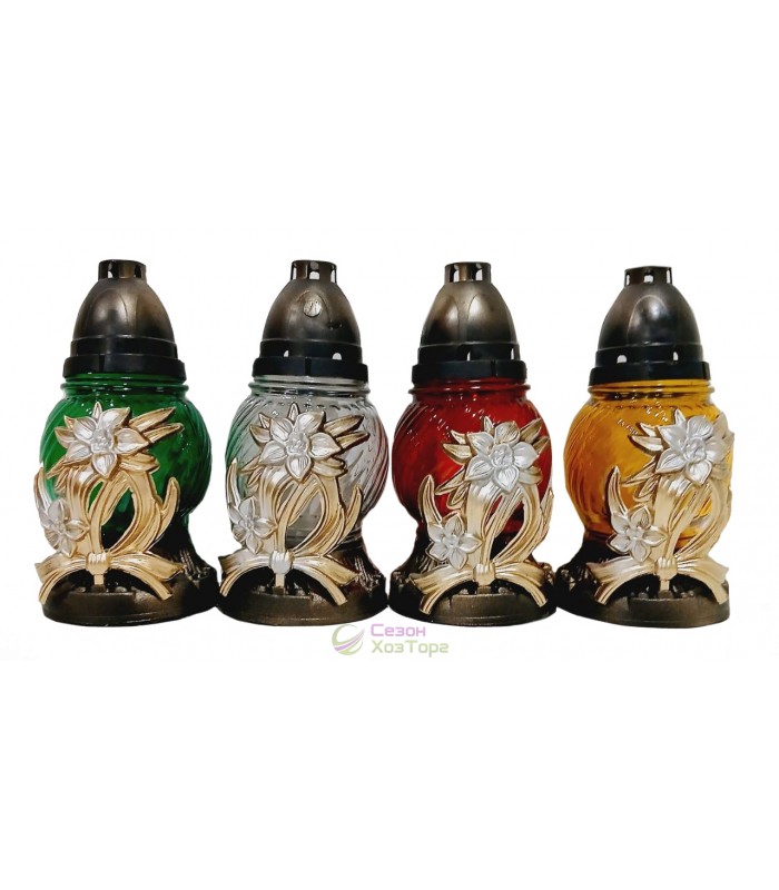 Лампадка стеклянная, лампада поминальная является одним из обязательных обрядовых атрибутов христианской веры, используемая при крещении, венчании, погребении. Чаще всего лампадку ставят в честь святого праздника Пасха, в поминальные дни. Данная лампадка содержит свечу из парафина до 24 часов горения. В последствии можна заменить израсходованную свечку на новую. Модель выполнена в форме овала, пластиковая подставка имеет дополнительное съемное декоративное украшение в виде нарцисса. В комплект входит пластиковая куполообразная крышка.