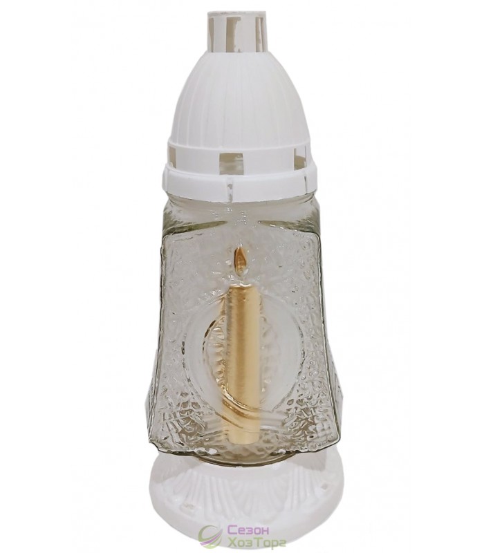 Лампадка стеклянная, лампада поминальная является одним из обязательных обрядовых атрибутов христианской веры, используемая при крещении, венчании, погребении. Чаще всего лампадку ставят в честь святого праздника Пасха, в поминальные дни. Данная лампадка содержит свечу из парафина до 36 часов горения. В последствии можна заменить израсходованную свечку на новую. Модель имеет фигурную форму, выполнена в белом цвете. На стенке корпуса нанесен рельефный рисунок в виде свечи. В комплект входит пластиковая куполообразная крышка и подставка.