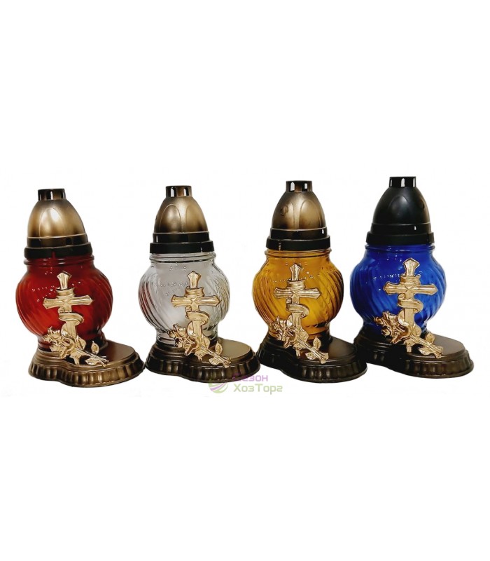 Лампадка стеклянная, лампада поминальная является одним из обязательных обрядовых атрибутов христианской веры, используемая при крещении, венчании, погребении. Чаще всего лампадку ставят в честь святого праздника Пасха, в поминальные дни. Данная лампадка содержит свечу из парафина до 24 часов горения. В последствии можна заменить израсходованную свечку на новую. Модель имеет округлую форму, на пластиковой подставке находится дополнительное съемное декоративное украшение в виде креста. В комплект входит пластиковая куполообразная крышка.
