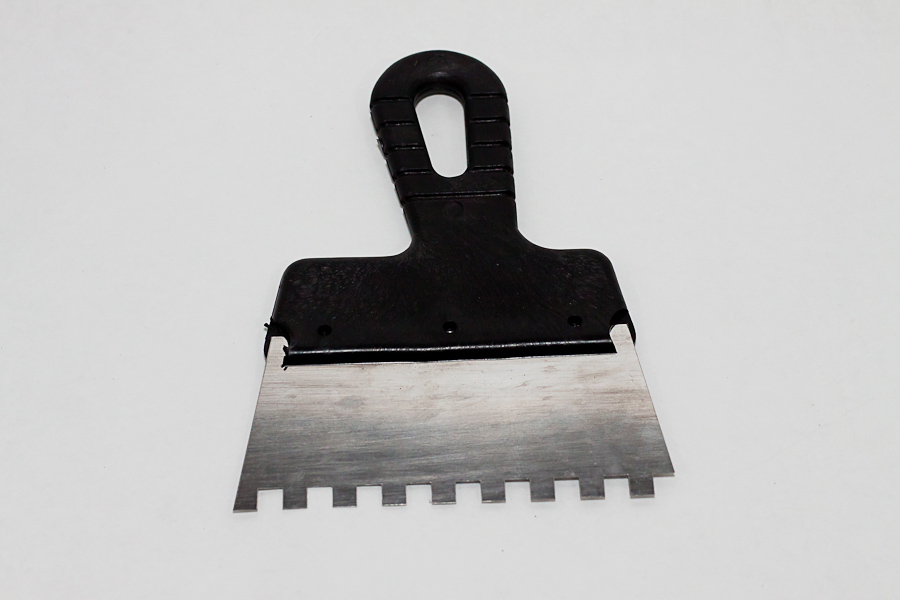 2. Зубчатый шпатель применяется для нанесения клеевого состава на облицовочный материал и обрабатываемую поверхность. Представляет собой стальной шпатель с рукояткой, нижнее основание рабочего полотна которого преобразовано в линию с нарезанными зубьями. Такая конфигурация полотна позволяет шпателю создавать борозды при покрытии внутренней основы кафеля или плитки, создающих дополнительную герметичность при фиксировании к отделочной поверхности.