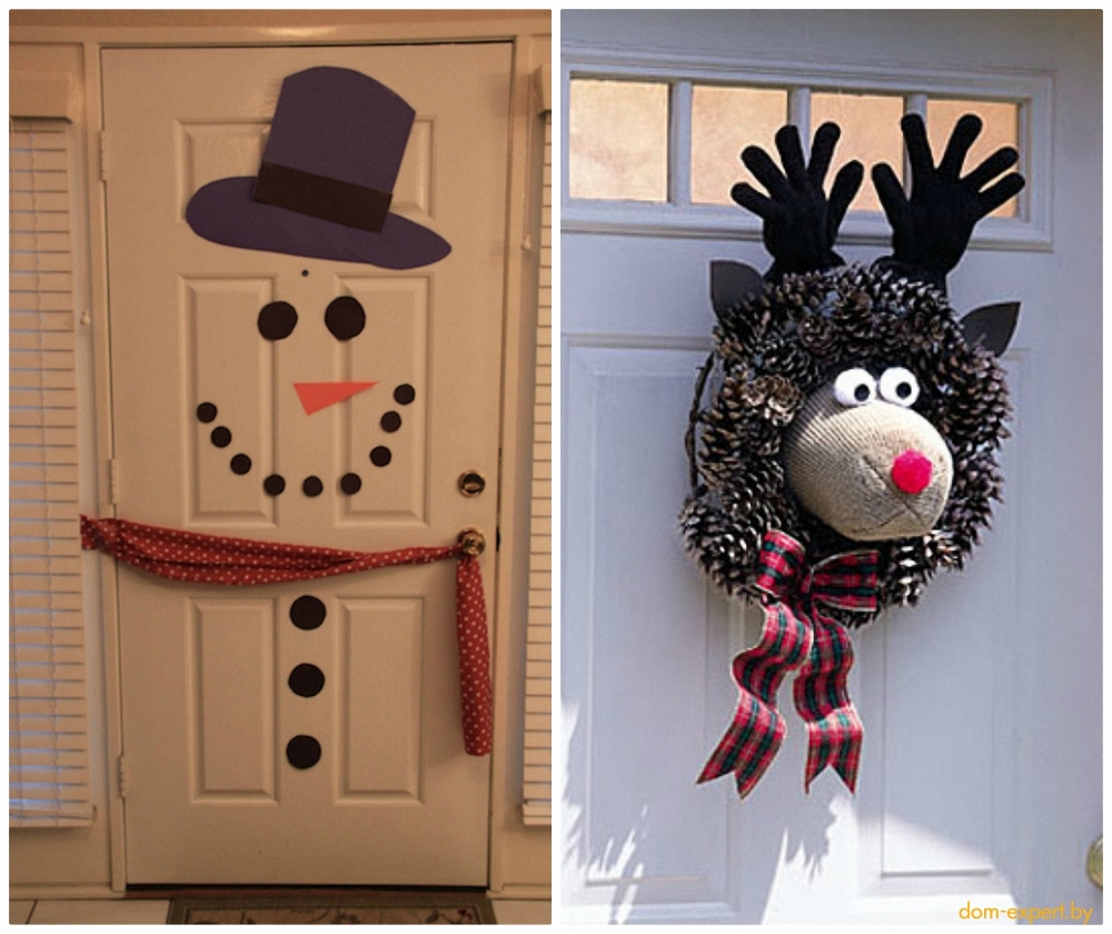 Щоб сусідам також було весело, можна повісити традиційний різдвяний вінок. Або вирізати кружечки і зробити смішну усміхнену мордочку сніговика. Ніс-морквину вирізаємо з паперу або кольорового картону.