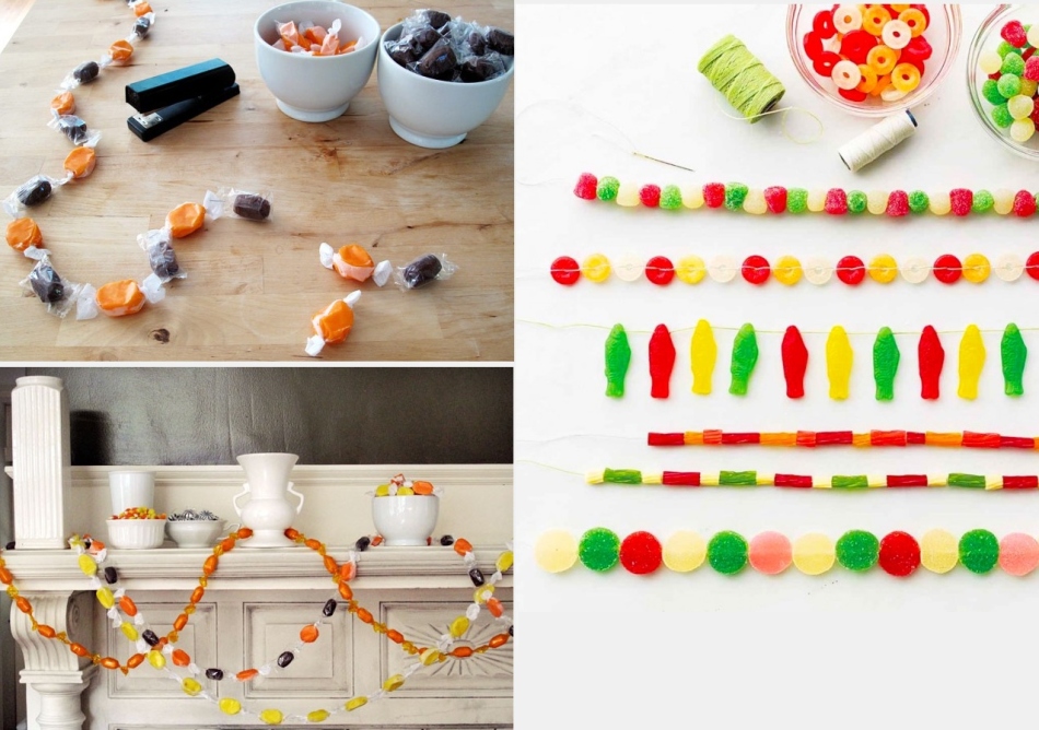 Робимо новорічну гірлянду із цукерок. Для цього різнокольорові обгортки нанизаємо на нитку та підвісимо у будь-якому місці. Особливо добре така гірлянда виглядатиме в дитячій, ось тільки важливо простежити, щоб цукерки «дожили» до нового року.