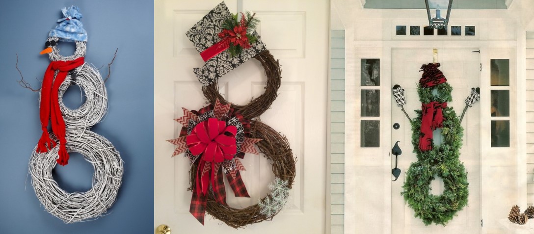 Навіть цей елемент може перетворитись. Варто лише з'єднати три вінки різної величини в єдине ціле і вийде справжній сніговик. Завершить образ капелюшок, вирізаний із чорного картону та бантик із червоної стрічки.