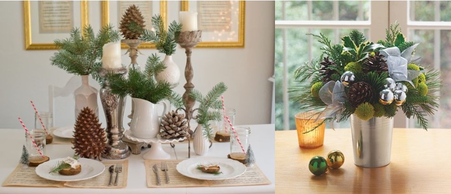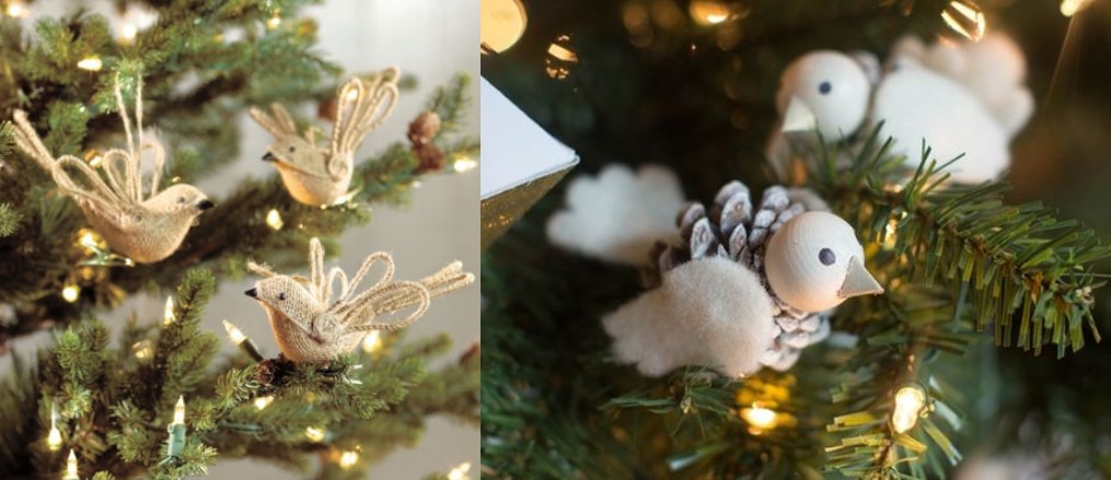 Якщо в будинку є хоч одна штучна пташка, то її також використовуватимемо в декорі. Для цього можна взяти гілочки, на яку розміщується птах. Інші прикраси можуть бути традиційними новорічними. У ролі пташок можуть виступити і шишки.