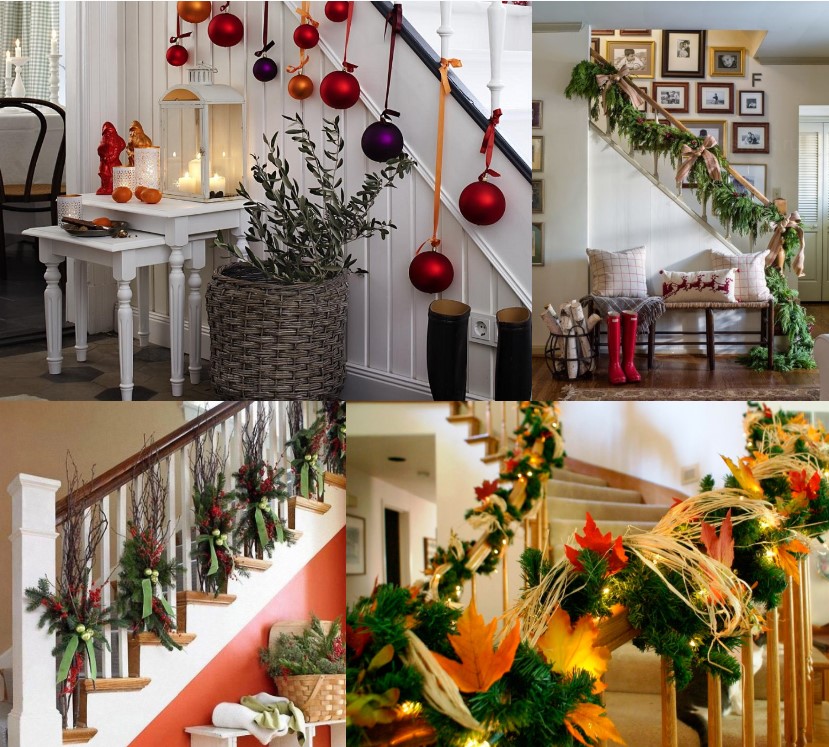 Якщо в будинку є сходи, то вони можуть пригодитися за елемент декору. Збоку на сходах можна розкласти сніг, а поруччя прикрасити дощем чи іграшками. При цьому важливо приділити належну увагу безпеці.