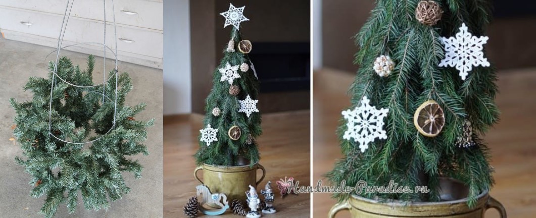 Якщо в лісі зібрати гілочки ялинки, то на неї не доведеться витрачатися зовсім. Композицію дерева можна викласти із гілок. І творіння акуратно прикрасити іграшками.