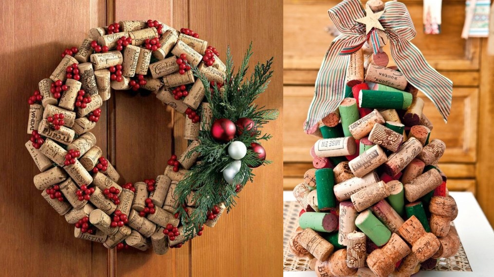 Так, якщо цілий рік збирати винні пробки, можна отримати дуже гарний декор. З них можна зробити як саму ялинку, так і оригінальний натюрморт. А якщо витратити 30 хвилин, то можна створити незвичайний вінок на вхідні двері.