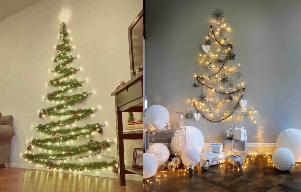 Таку ялинку можна викласти просто на стіні. Для цього використовується простий скотч. Ялинка може бути як великою, так і зовсім скромною. Недорогі новорічні гірлянди можна подивитися тут.