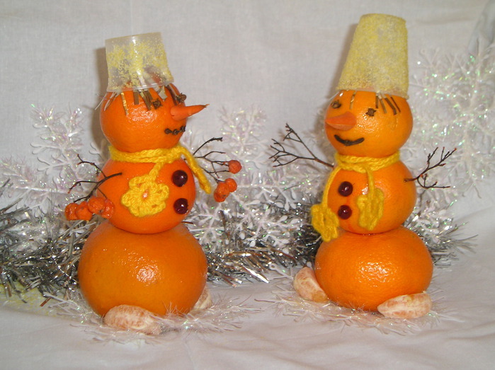 Улюблені мандарини перетворюються, якщо їм домалювати очі, або спорудити сніговика. А ось для бананів можна зробити новорічні шапочки. Для цього коло з червоного паперу згортають по осі і з'єднують за допомогою степлера.