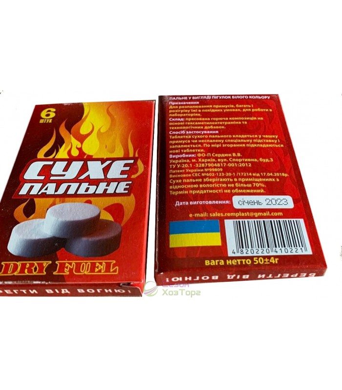 Сухе пальне у таблетках використовується для розпалювання дров, деревного вугілля або як самостійне джерело вогню. Застосовується в побутових та польових умовах, армійських та туристичних походах, на рибалці. Сухе пальне - це потужне джерело тепла, при горінні не залишає золи, має безбарвне полум'я, легко запалюється та гаситься.