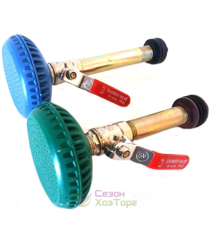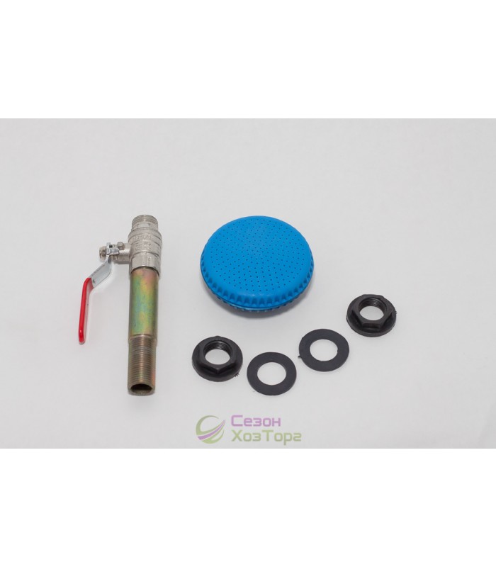 Душ комплект металевий призначений для з'єднання з системою літнього душу. Кран виготовлений з металу, його довжина складає 15 см. Насадка виконана з високоміцного пластику, діаметр насадки становить 9 см. Різьблення з двох сторін - 3/4". У комплект входить 2 гумові гайки і 2 прокладки.
