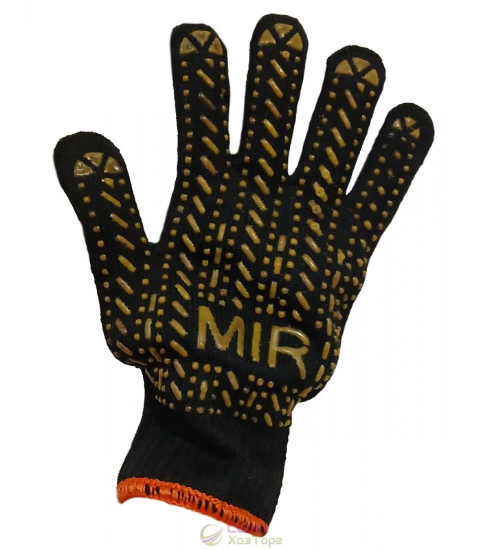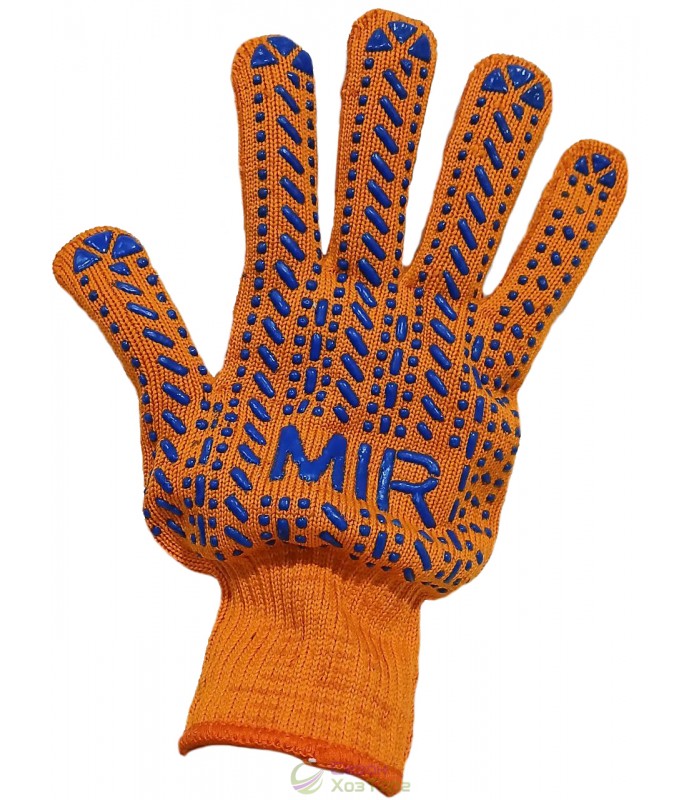 Рукавички робочі з крапковим покриттям з ПВХ та нанесеним написом MIR вважаються одними з найміцніших у ряді аналогічних виробів. Використовуються в садово-городніх, будівельно-ремонтних, вантажно-монтажних та господарсько-побутових роботах. Дані рукавички характеризуються високою зносостійкістю та гарним зчепленням з предметами. З'єднання бавовняних ниток із синтетичними волокнами забезпечує високу міцність матеріалу та його розтяжність. Дані рукавички не викликають пітливості в шкірних покривах, повітряобмін здійснюється завдяки вмісту бавовняного матеріалу у складі внутрішньої поверхні рукавички.