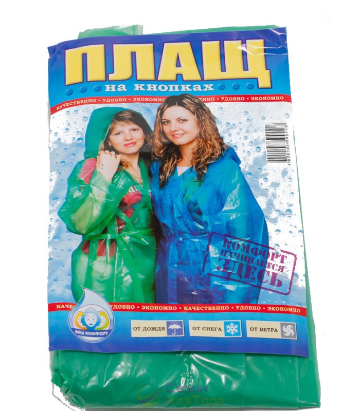 Плащ дощовик на кнопках виготовлений із плівки товщиною 60 мкм. Модель випускається в одному розмірі, і розрахована на людину середньої статури та зросту. Особливістю цього дощовика є наявність пластикових кнопок, завдяки яким плащ фіксується по фігурі. У місцях розташування кнопок товщина матеріалу збільшена, тому можна не перейматися міцністю виробу. Щільність плівки, з якої виконаний дощовик дозволяє його багаторазово використовувати, Плащ дощовик на кнопках випускається в компактній упаковці, в різних кольорах. Ця модель дощовика стане незамінною у використанні для людей, які ведуть активний спосіб життя, при поїздках на дачу, у ліс, в походах, на рибалці, а також для співробітників торгової, будівельної та сільськогосподарської сфери, які працюють на відкритому повітрі.