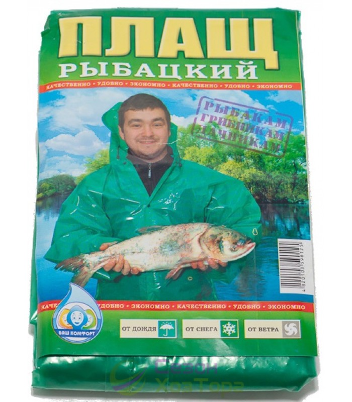 Плащ рибальський дощовик на кнопках виготовлений з плівки товщиною 100 мкм, виконаний в одному кольорі -темно-зеленому, розмір рибальського дощовика, в порівнянні з іншими моделями плащів, збільшений. Цей дощовик можна спокійно одягати на зимовий верхній одяг, і він не сковуватиме в рухах. Завдяки збільшеній щільності матеріалу, при акуратному зберіганні термін використання моделі може бути продовжений до року. Особливістю цього дощовика є наявність пластикових кнопок, завдяки яким фіксується плащ. У місцях розташування кнопок товщина матеріалу збільшена, тому можна не перейматися міцністю виробу. Плащ дощовик рибальський на кнопках стане незамінним не тільки для затятих рибалок, а й для людей з активною життєвою позицією, які не відкладають свої справи через негоду.