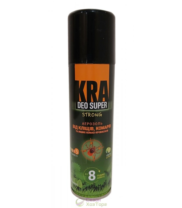 Аерозоль KRA deo super Strong використовується для захисту від кліщів, комарів, ґедзів та інших комах шляхом нанесення на відкриті ділянки шкіри та одяг. Забезпечує ефективний захист до 8-ми годин. Не наносити на шкіру більше двох разів на день. При нанесенні на одяг захищає від кліщів до 5 діб (за умови зберігання її в поліетиленовому пакеті).