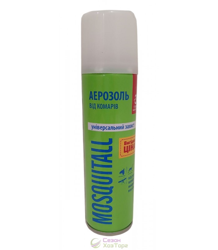 Аерозоль MOSQUITALL призначений для нанесення на одяг та шкіру, захищає від укусів комарів, мокреців, ґедзів. Рекомендується використовувати при знаходженні на вулиці, поході, лісі, біля водойм. Терміни дії засобу – до 3 годин.
