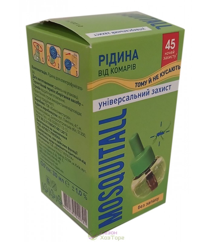 Рідина MOSQUITALL має спеціальний склад без запаху. Забезпечує надійний захист від комах протягом 45 ночей.