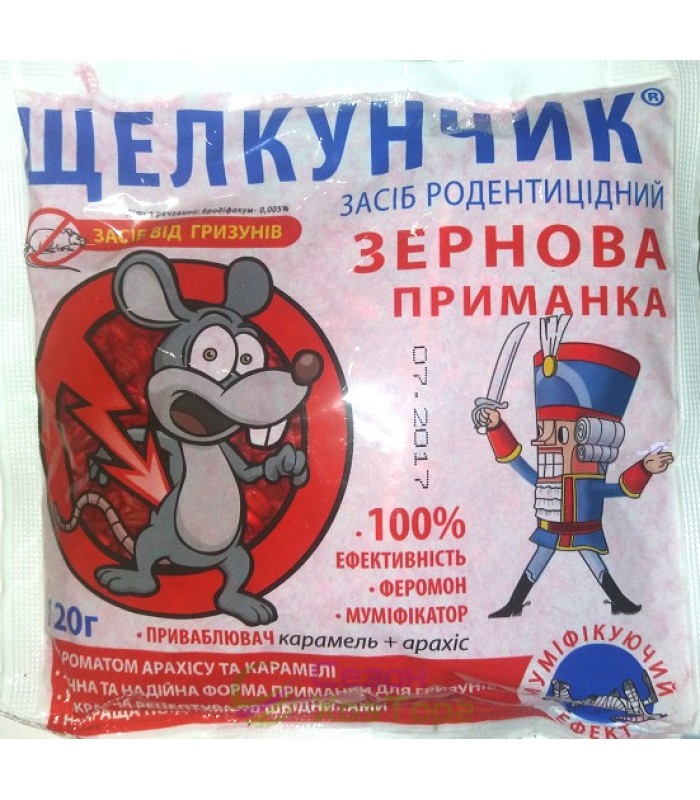 Родентицидний засіб "Лускунчик" у вигляді зернової суміші використовується для знищення щурів і мишей, для дератизації на об'єктах різних категорій та в умовах побуту як готова приманка. Механізм дії засобу складається із властивостей діючої речовини. Вона є антикоагулянтом, який при попаданні в організм шкідника порушує утворення вітаміну К1, який відповідає за утворення білків протромбінового комплексу. Через 1-2 дні після вживання летальної дози приманки, рівень згортання крові у гризунів різко сповільнюється, що призводить до кровотеч як внутрішніх, так і зовнішніх. Загибель настає через 3-7 діб. Засіб діє навіть у разі резистентності гризунів до інших приманок.