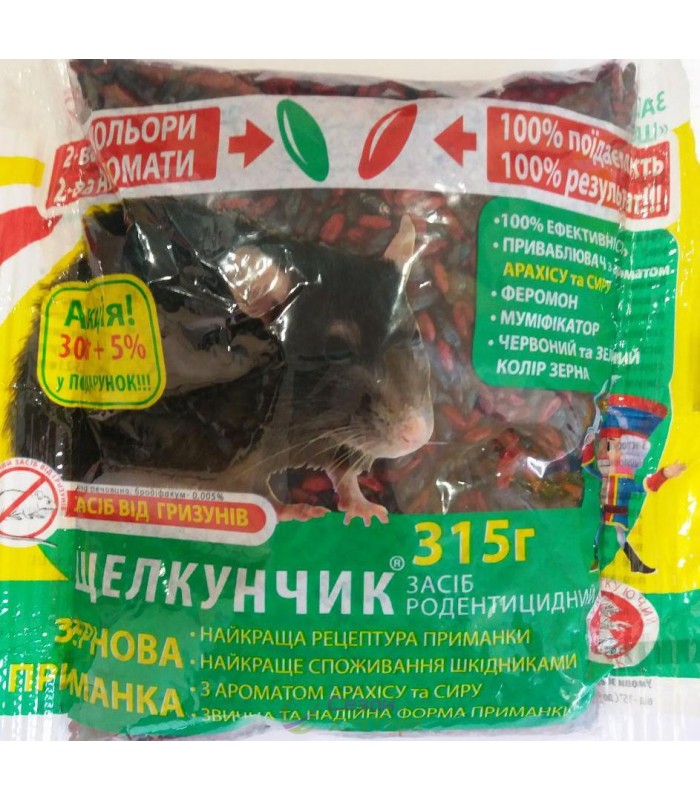 Родентицидний засіб "Лускунчик" у вигляді зернової суміші використовується для знищення щурів і мишей, для дератизації на об'єктах різних категорій та в умовах побуту як готова приманка. Механізм дії засобу складається із властивостей діючої речовини. Вона є антикоагулянтом, який при попаданні в організм шкідника порушує утворення вітаміну К1, який відповідає за утворення білків протромбінового комплексу. Через 1-2 дні після вживання летальної дози приманки, рівень згортання крові у гризунів різко сповільнюється, що призводить до кровотеч як внутрішніх, так і зовнішніх. Загибель настає через 3-7 діб. Засіб діє навіть у разі резистентності гризунів до інших приманок.