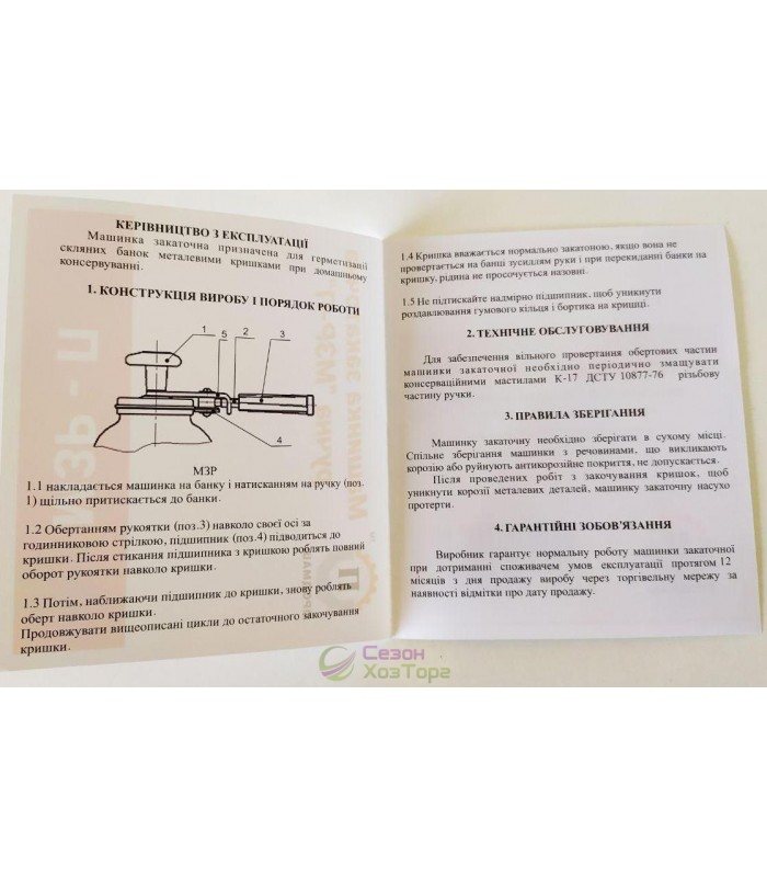 Машинка закочувальна механічна призначена для герметичного закупорювання скляних банок типу СКО 1-82 металевими кришками під час консервування фруктів, ягід та овочів. Інструкція по застосуванню: Повертаючи бічну рукоять навколо своєї осі за годинниковою стрілкою, підводимо ролик (підшипник) впритул до кришки і робимо кілька обертів рукоятки навколо банки, після чого повторюємо операцію доти, поки кришка не закупориться.