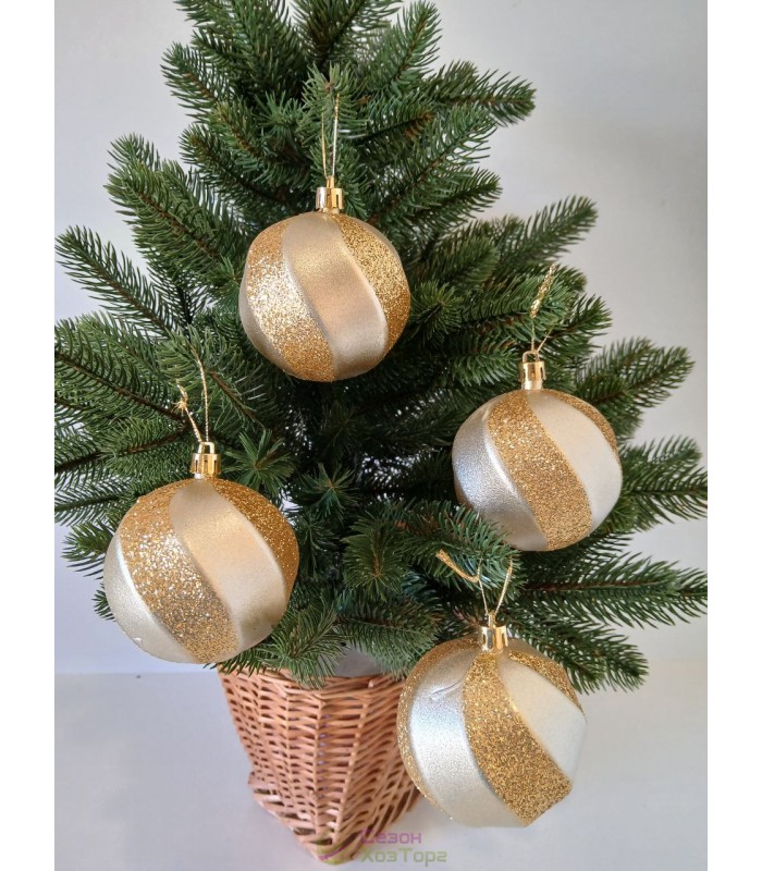 Новорічна куля в блискітках "Хвилька" Ø80мм бежева, ціна за набір 4шт