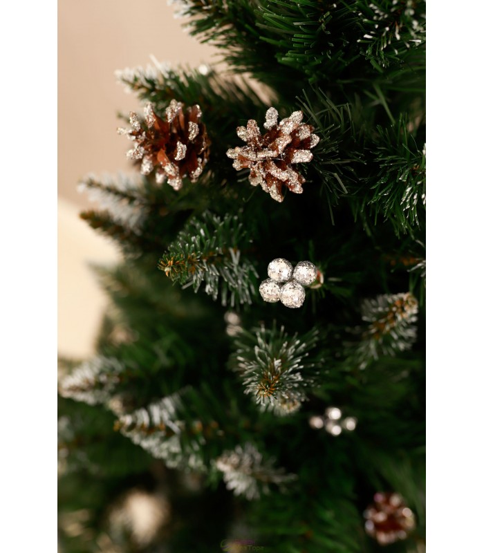 Ялина штучна Елітна з шишками та калиною 2,5 м з білим напиленням виготовлена відповідно до санітарно-епідеміологічних та гігієнічних вимог до продукції в Україні. Виготовлена із високоякісних матеріалів. Стовбур представлений розбірною трубкою, що складається з трьох частин, гілки складаються з дротяного каркаса, який відрізняється високою гнучкістю та міцністю. Голки виготовлені згідно з новими технологіями з ПВХ.