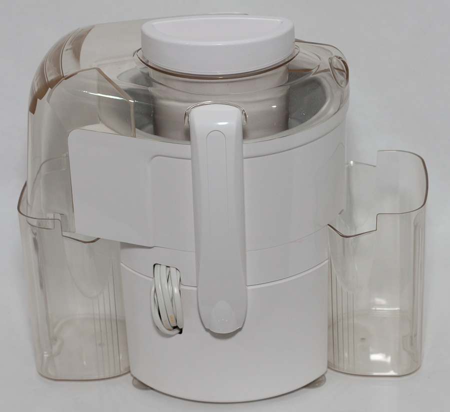 5. Відмінність у комплектації соковитискачів. Прилади можуть відрізнятися наявністю та кількістю контейнерів, розмірами, формою горловини та штовхача, приймальним лотком, довжиною шнура. Наприклад, зручніше працювати з широким приймальним лотком, а довжина мережевого шнура повинна становити не менше 1,5 м, відмінно, якщо він може забиратися в спеціальний відсік, намотуватися на барабан. У випадку, якщо Ви любите робити коктейлі, змішувати інгредієнти, вибирайте соковижималку з мірним приймальним контейнером.