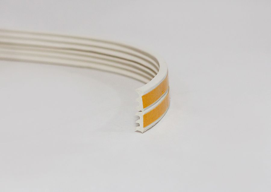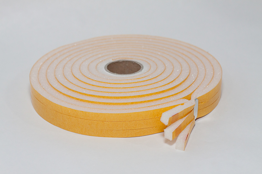 Утеплитель с самоклеющейся поверхностью представляет собой поролоновую полосу, одна сторона которой вскрыта клеем и защищена лентой. Принцип использования данного теплоизоляционного изделия аналогичный вышеописанному. Преимуществами применения этого уплотнителя является разработка производителями универсального размера для всех типов окон, его компактная упаковка и быстрый монтаж.